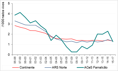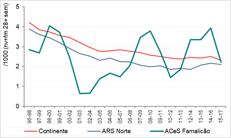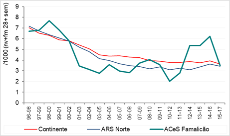 MORTALIDADE PERINATAL (/1000 (NV+FM 28+ SEM)), 1996-2017 (MÉDIA ANUAL POR
