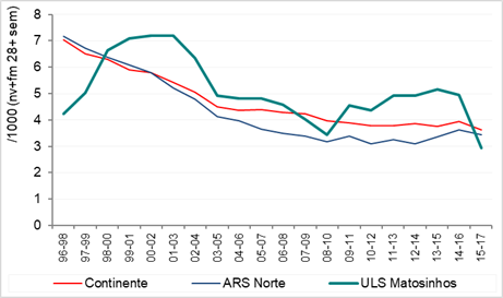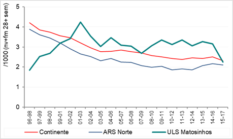 MORTALIDADE PERINATAL (/1000 (NV+FM 28+ SEM)), 1996-2017 (MÉDIA ANUAL POR